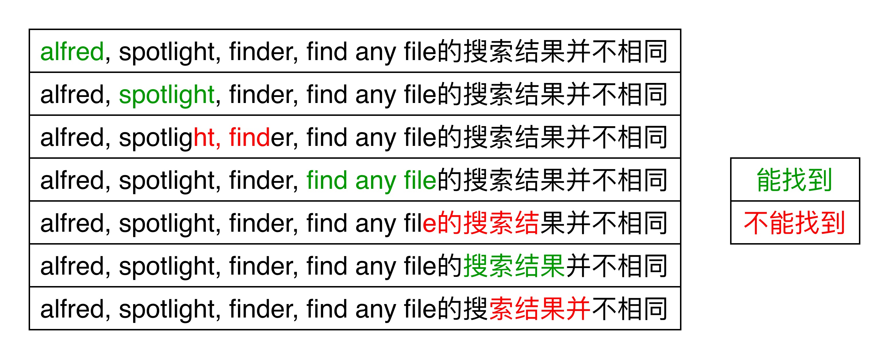 (最终并没有解决这个问题)alfred, spotlight, finder, find any file的搜索结果并不相同;目前发现的这种有问题的搜索都和中文/日文字符有关。