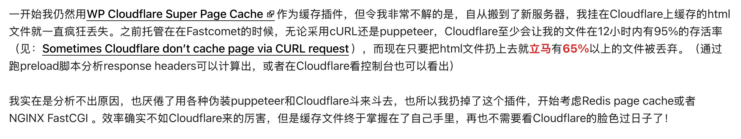 想过买APO吗?主要是好奇付费APO的page cache是不是100%稳定留存(反正免费插件cf super page cache不能),但最终还是没有掏钱尝试,因为读了一些文档后已经认为APO的page cache和其他缓存一样不是100%稳定的了。当然可以配合R2存储和cache reverse 把缓存内容放在R2存储里面作为cdn cache miss以后的保险。但问题又来了:删除机制非常不好使,不契合现在的preload.py.